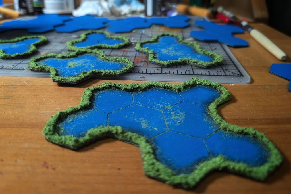 I made some good progress on these hex tiles. The large lake set is ready for the water effect. The way I do this is with some gel as sort of like a primer and the water texture on top. This usually takes about 2-3 pours. With the extremely long drying time, they should be complete on Monday. These hex tiles narrowly escaped a major issue..